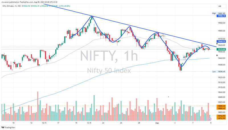 Instead what has formed currently is more or less like a bearish trend continuation pattern if Nifty does not cut through 19680 by tomorrow. My personal conviction is 60% neutral and 40% bearish tomorrow. Few sectors like Nifty Metal, Nifty Energy, Nifty FMCG, Nifty Commodities, Nifty Auto, Nifty Consumption were in red today which is building a case for a bearish event. Guess it’s safe to monitor the trades tomorrow and update if we have a change in stance.