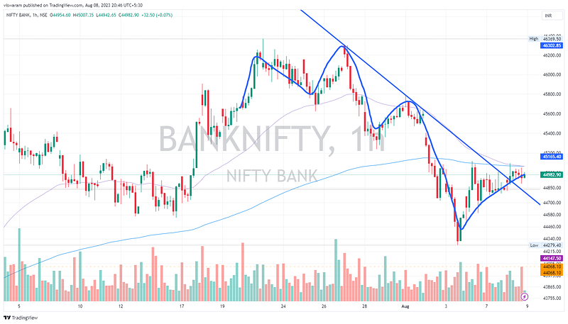 The change in stance from bearish to neutral worked well for banknifty today. We have marginally closed above the trendline. But for a bullish breakout we need to take back the 45400–45600 levels soon — I am not sure if there is enough momentum for that right now.