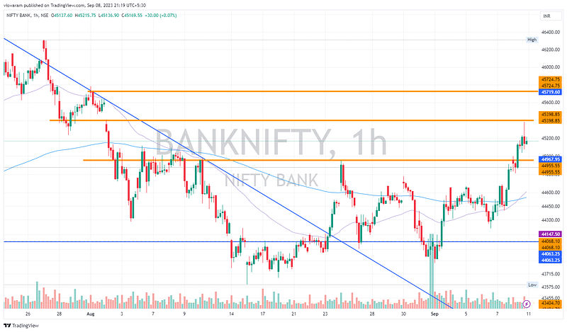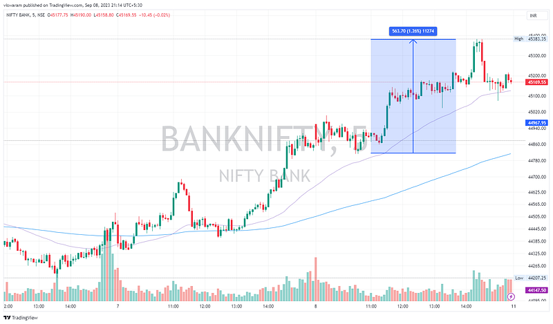 Banknifty was also continuing from the momentum it got from the last hours of 6th Sep. We had an intraday rally of 563pts ~ 1.26% to hit a new swing high of 45383. Again the bulk of the contribution came from HDFCBK.