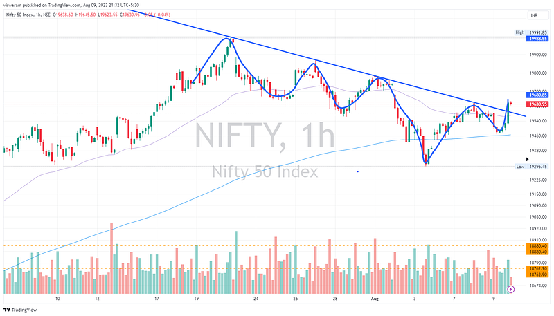 The 14.15 hourly candle that added 111pts ~ 0.57% has changed the game for Nifty. It ensured the final close is above the bearish trend line. The options premium of both PE and CE were abnormally low in spite of strong swing. This also limited my fire-fighting capabilities. For tomorrow I wish to stay neutral to start with, go long if 19700 levels are taken out and go short if we fall to 19550 levels.