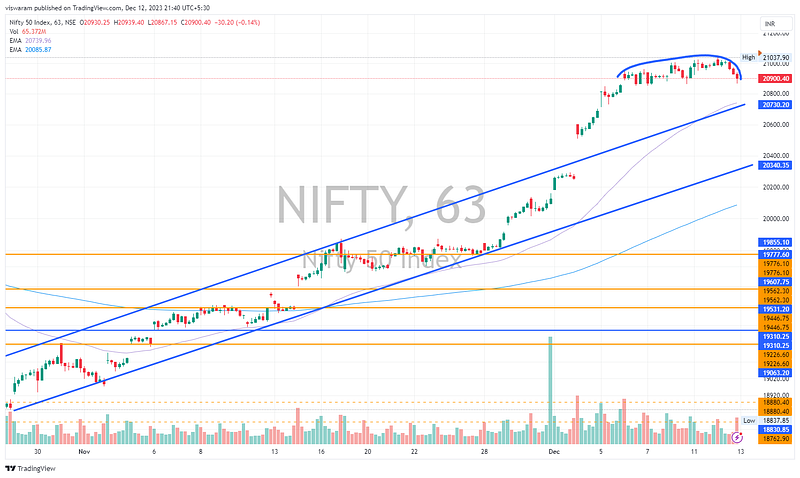 Nifty can fall a lot more and still be in the uptrend. That is because we are well above the ascending channel. But from a real price action perspective, I have changed my ultra short-term stance to neutral now. To gain back the bullish momentum, Nifty has to close above 21037. To go bearish, Nifty has to fall below 20691.