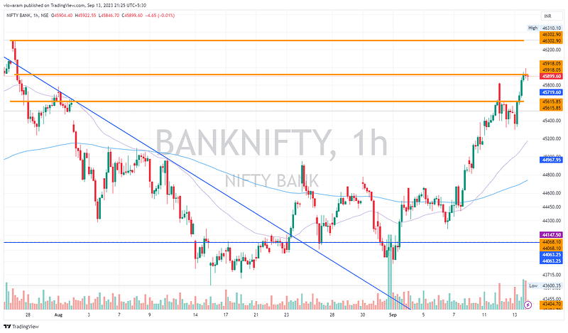 On the 1hr chart the next resistance should be around the 46302 levels whereas the next support will be 45615. I wish to stay moderately bullish ie. 50% bullish & 50% neutral until the resistance is not taken out. In case we have a beach in support — I wish to go short.