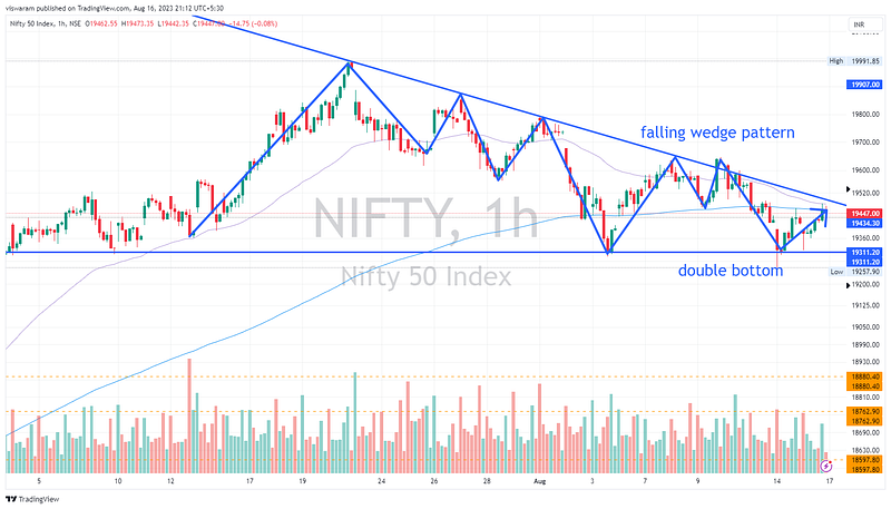 If we look at the 1hr TF — the double bottom @ 19311 stands strong, and the bearish trend line is converging. Till date the tops Nifty has made has respected the trend line — this could also mean the falling wedge pattern could hold true. If yes — its a bullish pattern and we could have a trend reversal soon.