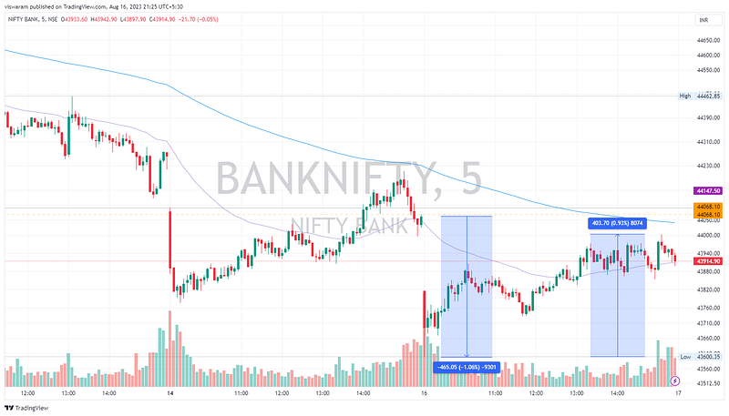 From the moment we started today, Banknifty looked and stayed bearish for the entire day today. In the opening minutes we dropped 1.06% ~ 465pts and then there was a decent recovery of 403pts ~ 0.93 by 15.05