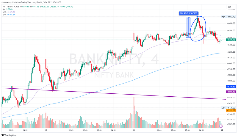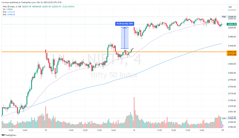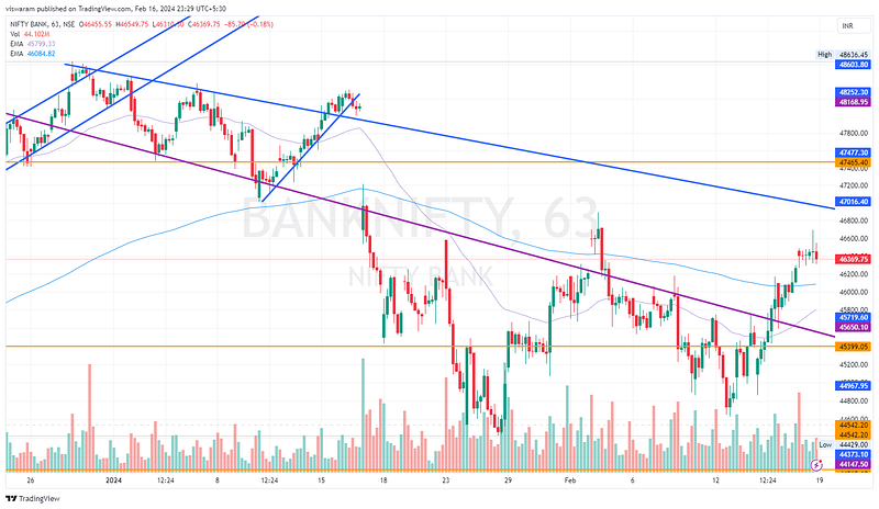 After the first 63-minute candle we revised our stance to bullish, if you have read our last few reports — you would understand the rationale too. See the island formed above the resistance level of 21913. It is a classic breakout formation. From 15th Dec 2023 to 15th Feb 2024 — Nifty was in a narrow range of 21491 to 21913 with a couple of false breakouts/breakdowns. So we are keeping our fingers crossed this time to validate whether it works out. One way to do that is to check for follow-through price action. Blips do not last that long and we usually fall below the resistance (just like what happened on the last 2 occasions). Today is the first time I guess Nifty made the move ahead of BankNifty for a direction change. BankNifty has a lot of headroom left and if it catches up to its ATH — the impact on Nifty is going to be more than awesome.