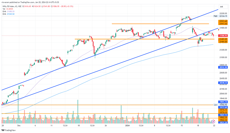 Nifty was unable to get into the ascending channel despite results from RELIANCE and major banks. We suspect some weakness is haunting N50. It could completely be news/event-driven or related to the build-up for the budget session. The selling figures from the institutions may be because of this. From a technical analysis perspective, Nifty looks range bound between 21913 and 21491. Falling below 21491 could auto-trigger further shorts and it could even be an avalanche. Our stance remains neutral for Tuesday, also note that Monday will be a holiday for the consecration of Ram Mandir in Ayodhya.