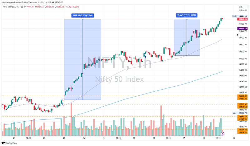Nifty is up an impressive 526pts ~ 2.71% between the last expiry & today. This is by far the most impressive breakout by Nifty. From the last known resistance level of 18880, nifty is up 6.07% ~ 1142pts in a span of 3 weeks.