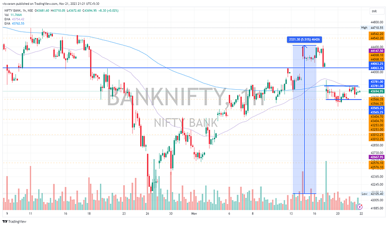 On the 1hr TF, BankNifty has fallen from the recent swing high of 44420, it had amassed gains of 2321pts ~ 5.51% between 26th Oct to 16th Nov (A short span), so it looks like the bulls have not given up yet, and the bears are still not able to make inroads. The support of 43566 has proven quite strong in the last 3 sessions and the next resistance of 44063 is quite far away. Since we are in an indecision zone, I would like to revise my stance from bearish to neutral and go short only if the 43404 support is also getting knocked out.