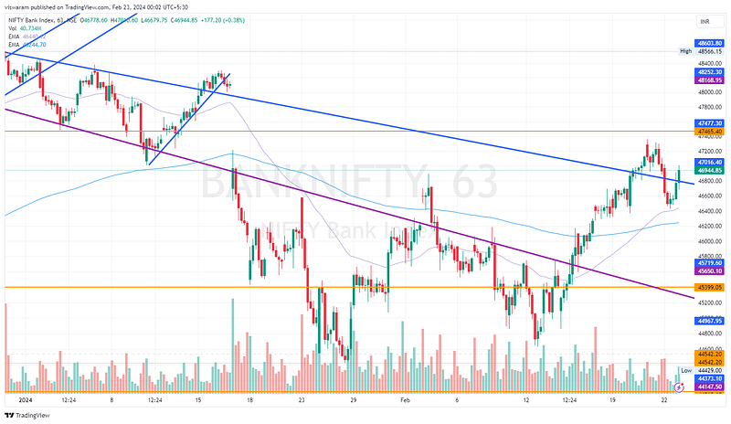 In fact, we had one 63mts candle below the blue trend line today and ideally, we should have changed the status from bullish to neutral. Had BN stayed lower and not reclaimed its lost ground, we would have 100% gone with a neutral stance for tomorrow. As it stands the next resistance is at 47465 and it is a tough level. If the euphoria from the US markets is spilling to ours tomorrow (SPX +1.96%, NDQ +2.87% as of writing) — then we might even have an outlier GREEN session tomorrow.