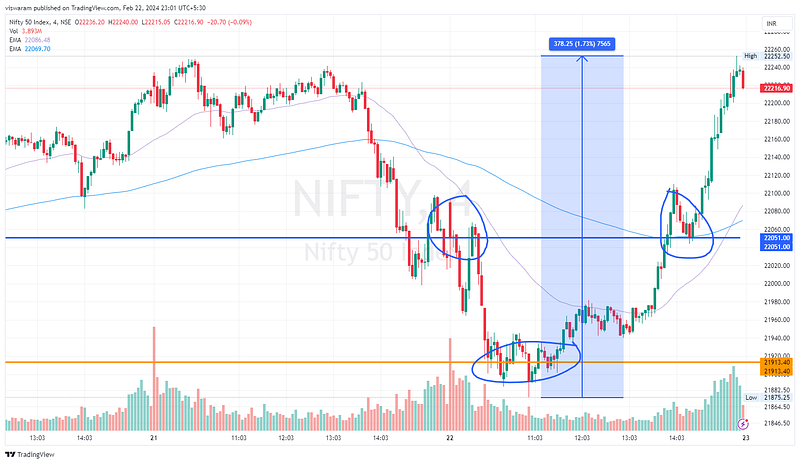 The 2nd encircled area was at the 21913 region i.e. from 10.03 to 11.35. When we saw the markets were not cracking further, we adjusted our “short CALL” positions, and as markets started recovering, we trailed the “short PUT” positions to offset the gain in the short CEs. Again our view went absolutely wrong when the markets did not stop at 22051, even though we had a pause between 13.47 and 14.27. What then followed was the dream of an option buyer and a nightmare for option sellers like me. The momentum was so strong that we took out the ATH. Nifty had an intraday swing of 378 points ~ 1.73%. The swing was so wild that it would have taken out any stop loss set on premiums, over the last few days — markets are really testing the nerves of option traders.