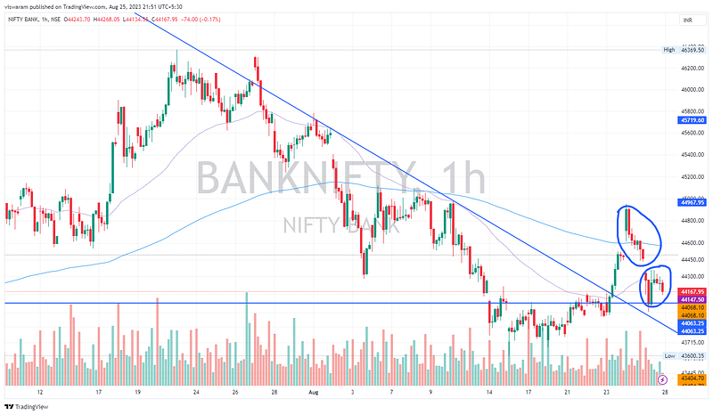 I wish to go 60% neutral and 40% bearish for 28th Aug. If the support falls in the first hour of trade on Monday, I prefer to go all-in for shorts. Only if we take out the 44500 via gap-up then we need to think about a long position.
