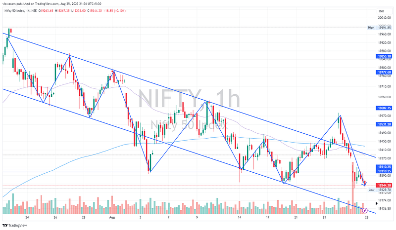 What this did to our markets is bring about a reversal in trend. Just the previous day we had a breakout from a falling wedge pattern and Nifty was breaking free to take out the 19700 levels — but this cut short.