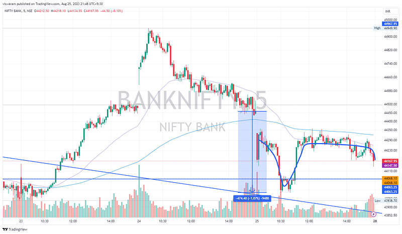 From an intraday fall of 1.07% it is quite commendable that banknifty was able to recover and close only 0.59% lower. I was not quite sure why banks werent falling like other non financial stocks. Finally we have closed above the support zone of 44068 which is quite good for the bulls.The options flow was also indicating no major swings today, the premiums of the OTMs were like an ordinary friday. I was hoping to make a good fortune today — but the premiums did not help.