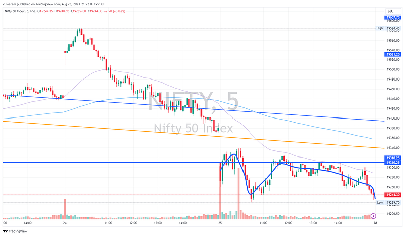 This is what I said in yesterday’s report “For tomorrow I wish to change my stance from bullish to bearish. If we trade above the trend line for more than an hour — I wish to go long. And if we fall below 19310 — I wish to go short. Till then prefer to stay neutral.” I took the short position right at the open as my short criteria met. But the position is still not so profitable as the market did not fall further. I was hoping for more than a 1%+ fall today.