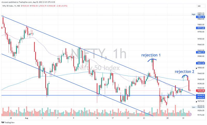 On the hourly TF we now have 2 rejections when Nifty tried to breakout from the bearish channel. Both of them had strong selling momentum which indicates the Big-Bear is still alive & kicking. If we take out the descending channel — the chart pattern will appear like a lower high and lower low in which the lower low is not that intense.