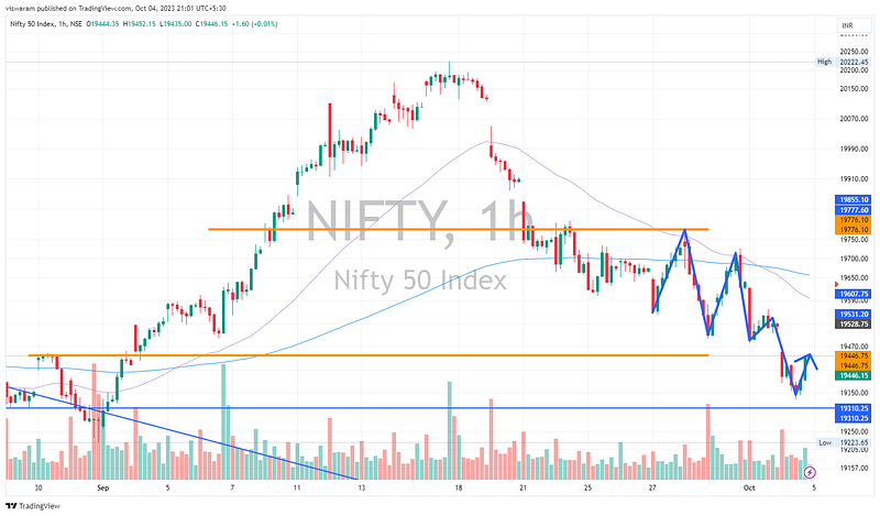 On the 1hr TF, Nifty complied with the double top pattern and showed its vulnerability by breaking the support line. The next support level of 19310 fell short by just 0.1%. If the current momentum holds — then it should be tested and taken out by tomorrow. We also have the expiry tomorrow — which may bring in some added uncertainties.