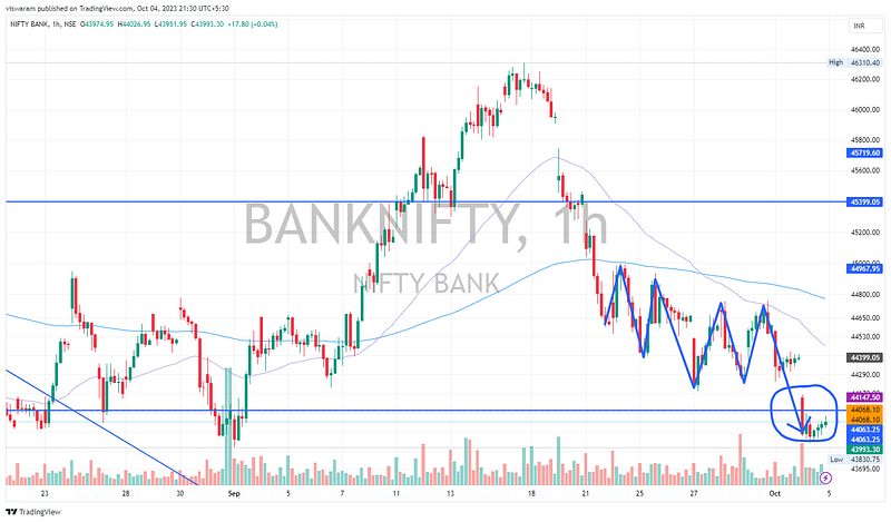 On the 1hr TF we have broken the support of 44068, yesterday’s bearish call worked out well despite the misadventure from HDFC. I would like to see if BN can cross this resistance level in the forenoon session. I still maintain the bearish stance with the next target being 43827 and then 43732.