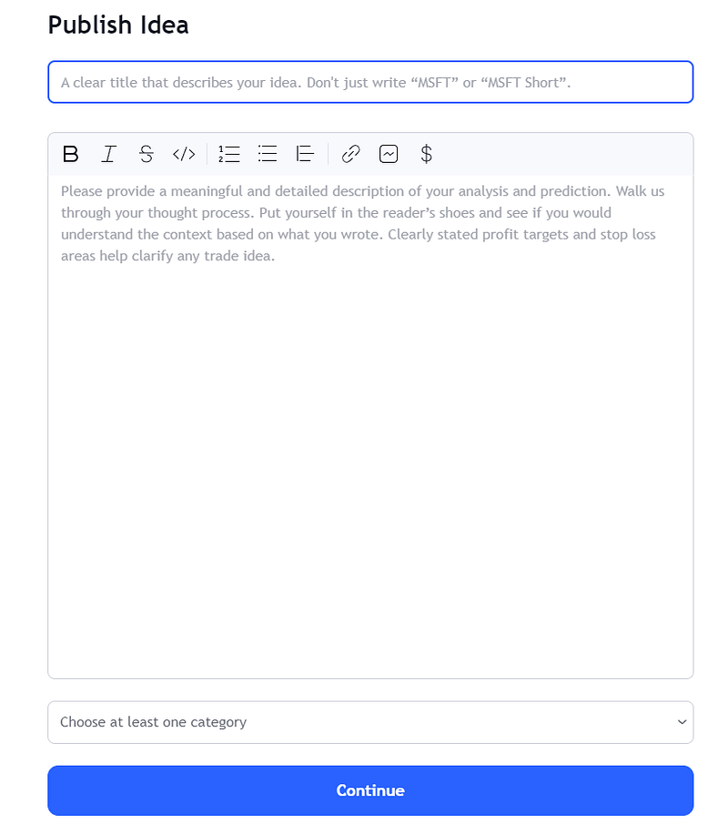 Publish Idea— This is where you share your chart, analysis, or idea with the public. You need not be a professional chartist to do it — you can start at an amateur level. As your work inspires others and helps them in their trading, you start gaining their respect. Few of them may even follow you and subscribe to your ideas.