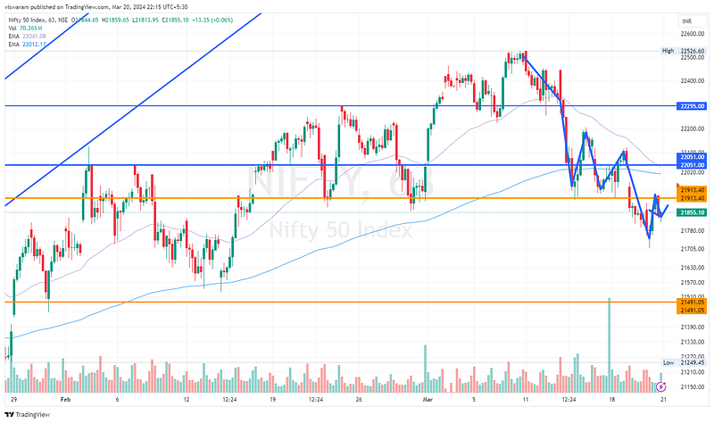 Nifty went ahead and broke the recent swing low. The lowest point today was 21710. From the open till 10.47 — the index played as per script, but what needs attention today is the 220pts ~ 1.02% recovery. I am reiterating how bad the situation is when “weak hands” hold the CE shorts. Thankfully we did not cut through the 21913 resistance, otherwise whatever bearish setup we had created would have split open.