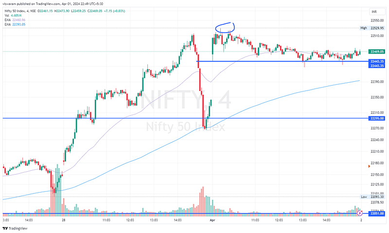 Nifty hit a new ATH today — 22529 and after that, the momentum faded slightly, but the downside was protected pretty well. 22443 acted as a good interim support. For all the non-directional option sellers, the first day of the new FY would have given a good green start to their PnL.