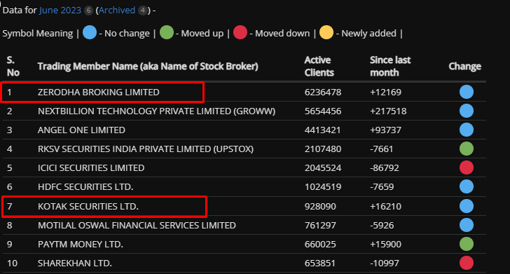 As per this article, Zerodha has 6236478 active clients and Kotak has 928090. This means Kotak is only 14% of the size of Zerodha as of June 2023.